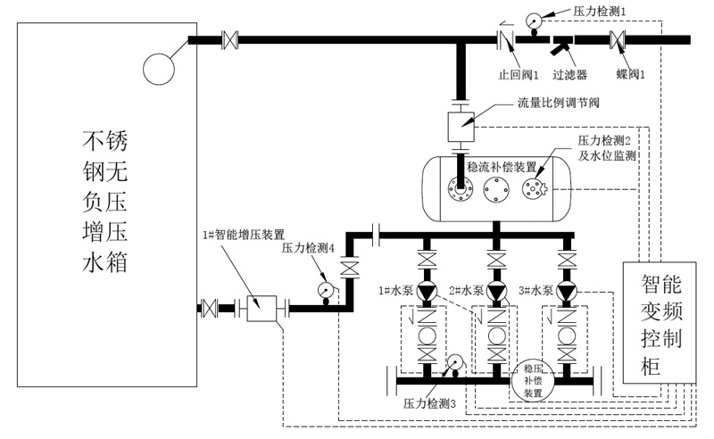 用水箱作為整個(gè)系統的備用水源,在自來(lái)水管網(wǎng)壓力不足或無(wú)水時(shí),自動(dòng)投入使用,補充供水,以保證供水的穩定性和連續性。 在自來(lái)水管網(wǎng)壓力恢復后自動(dòng)轉換為正常無(wú)負壓(疊壓)供水方式,水箱自動(dòng)補水,并自動(dòng)定時(shí)循環(huán)清潔箱內存水,以保證供水品質(zhì)。